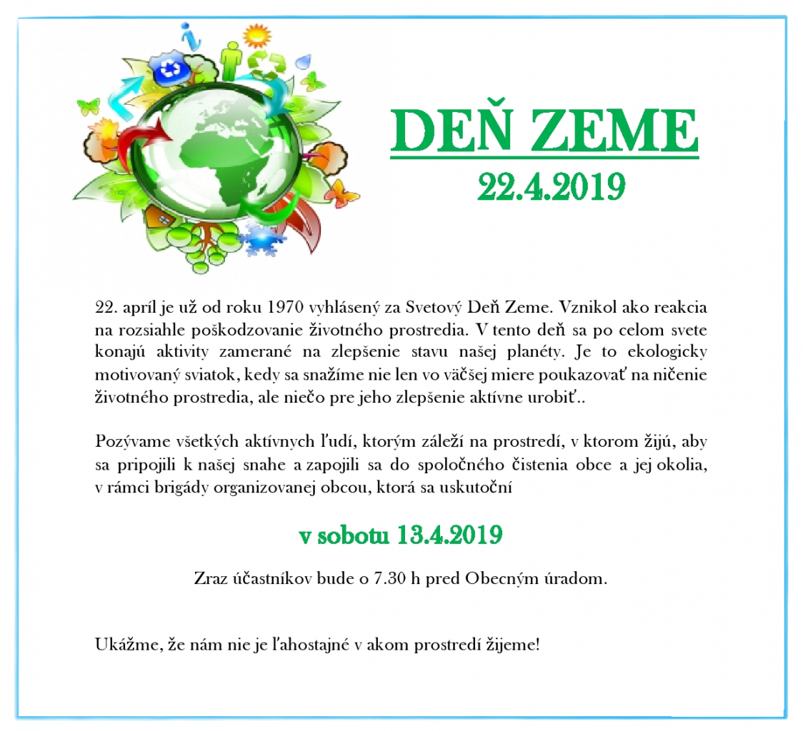 V sobotu 13.4.2019 pri príležitosti Dňa Zeme sa v našej obci uskutoční brigáda za účelom vyčistenia verejných priestranstiev obce a jej okolia.