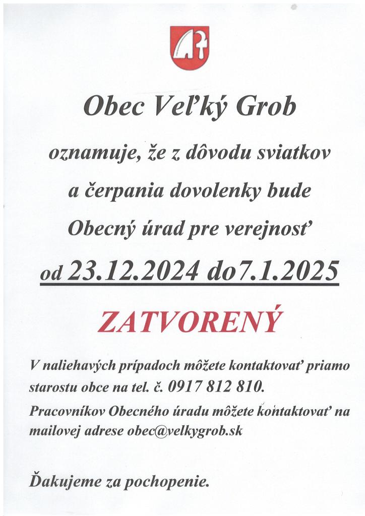V termíne od 23.12.2024 do 7.1.2025 bude Obecný úrad vo Veľkom Grobe pre verejnosť zatvorený. V naliehavých prípadoch je možné kontaktovať priamo starostu obce na tel. č. 0917 812 810, pracovníkov Obecného úradu môžete v prípade potreby kontaktovať na mailovej adrese obec@velkygrob.sk.