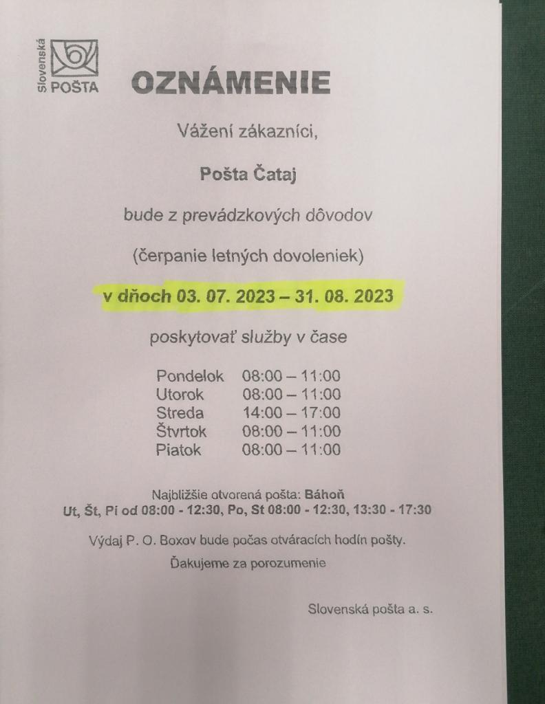 Pobočka Slovenskej pošty, a.s. v Čataji oznamuje, že v termíne od 03.07.2023 do 31.08.2023 bude prevádzka poskytovať služby v upravených časoch.