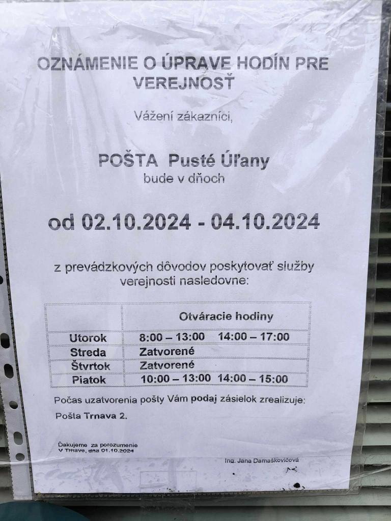 Oznam - Pošta Pusté Úľany 2