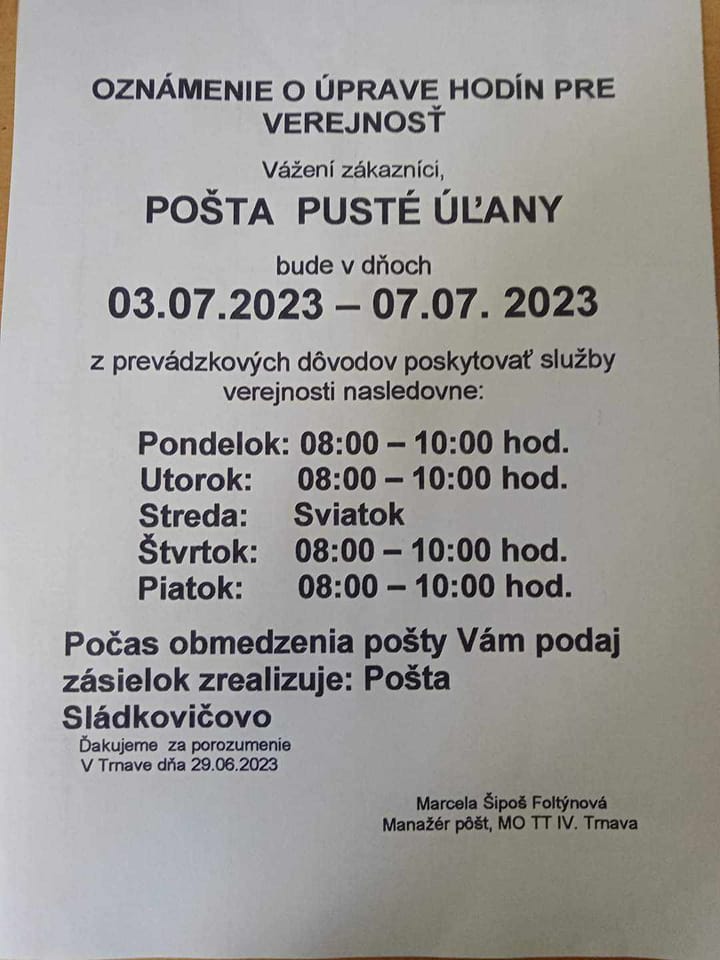 Pobočka Slovenskej pošty, a.s. v Pustých Úľanoch oznamuje, že v termíne od 03.07.2023 do 07.07.2023 bude prevádzka poskytovať služby v upravených časoch.