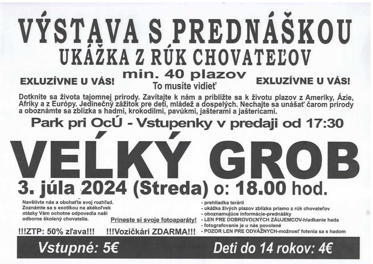 Pozývame Vás na výstavu exotických plazov, spojenú s prednáškou a možnosťou fotenia sa so zvieratami, ktorá sa bude konať v stredu 3. júla o 18:00 v parku vedľa Obecného úradu.