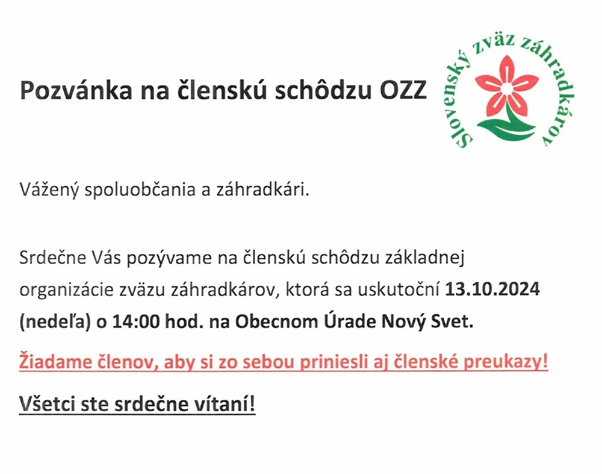 Členská schôdza základnej organizácie zväzu záhradkárov sa uskutoční 13.10.2024 o 14:00 na Obecnom úrade Nový Svet.
