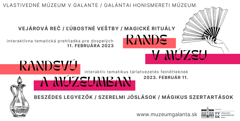 V sobotu 11. februára 2023 počas prehliadky expozíciami lektorky vyzdvihnú tématiku randenia a lásky v historických časoch, naučia Vás základom vejárovej reči, oboznámia Vás s ľúbostnou mágiou a budete si môcť pripraviť aj elixír lásky.