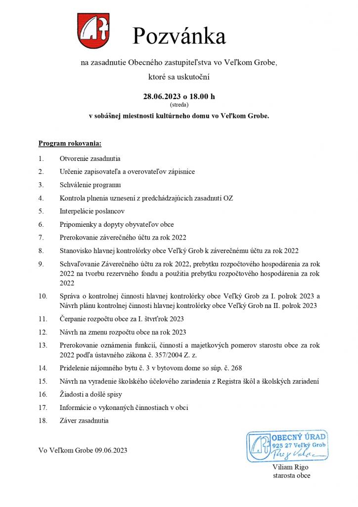 Pozvánka na zasadnutie Obecného zastupiteľstva