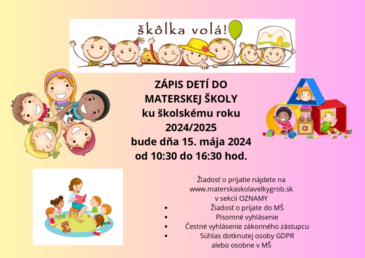 - Osobne počas zápisu do materskej školy 15.05.2024 od 10.30 do 16.00 hod.,