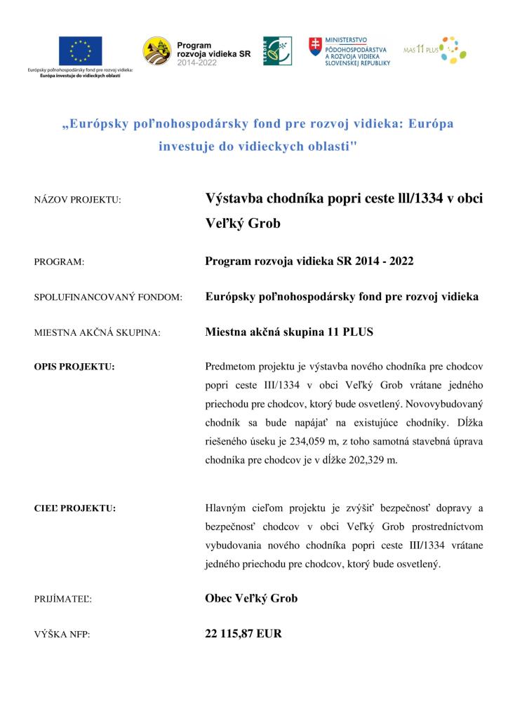 Účel: Hlavným cieľom projektu je zvýšiť bezpečnosť dopravy a bezpečnosť chodcov v obci Veľký Grob. Novovybudovaný chodník sa bude napájať na existujúce chodníky. Dĺžka riešeného úseku je 234,059 m, z toho samotná stavebná úprava chodníka pre chodcov je v dĺžke 202,329 m.